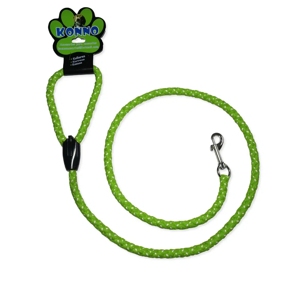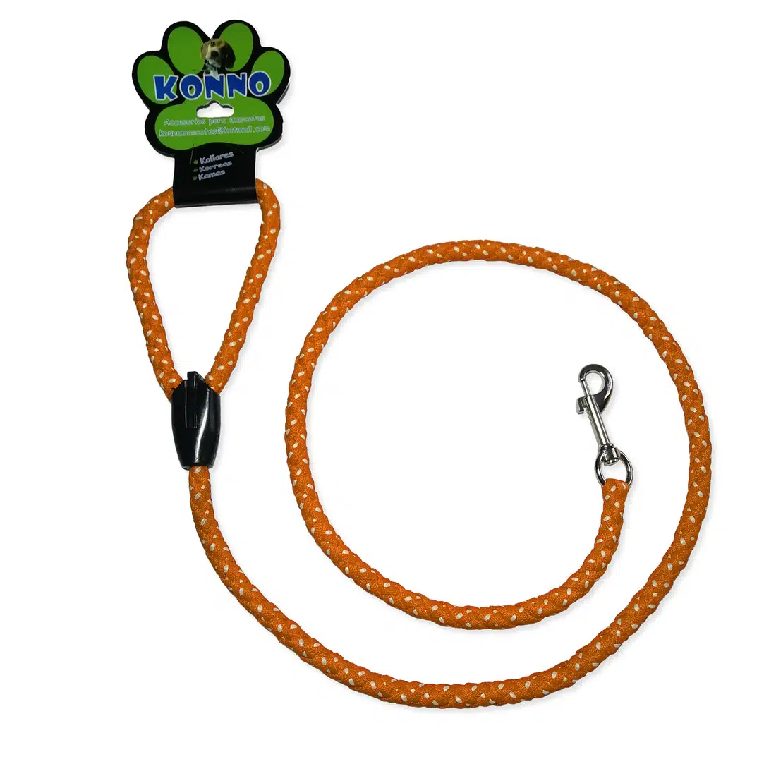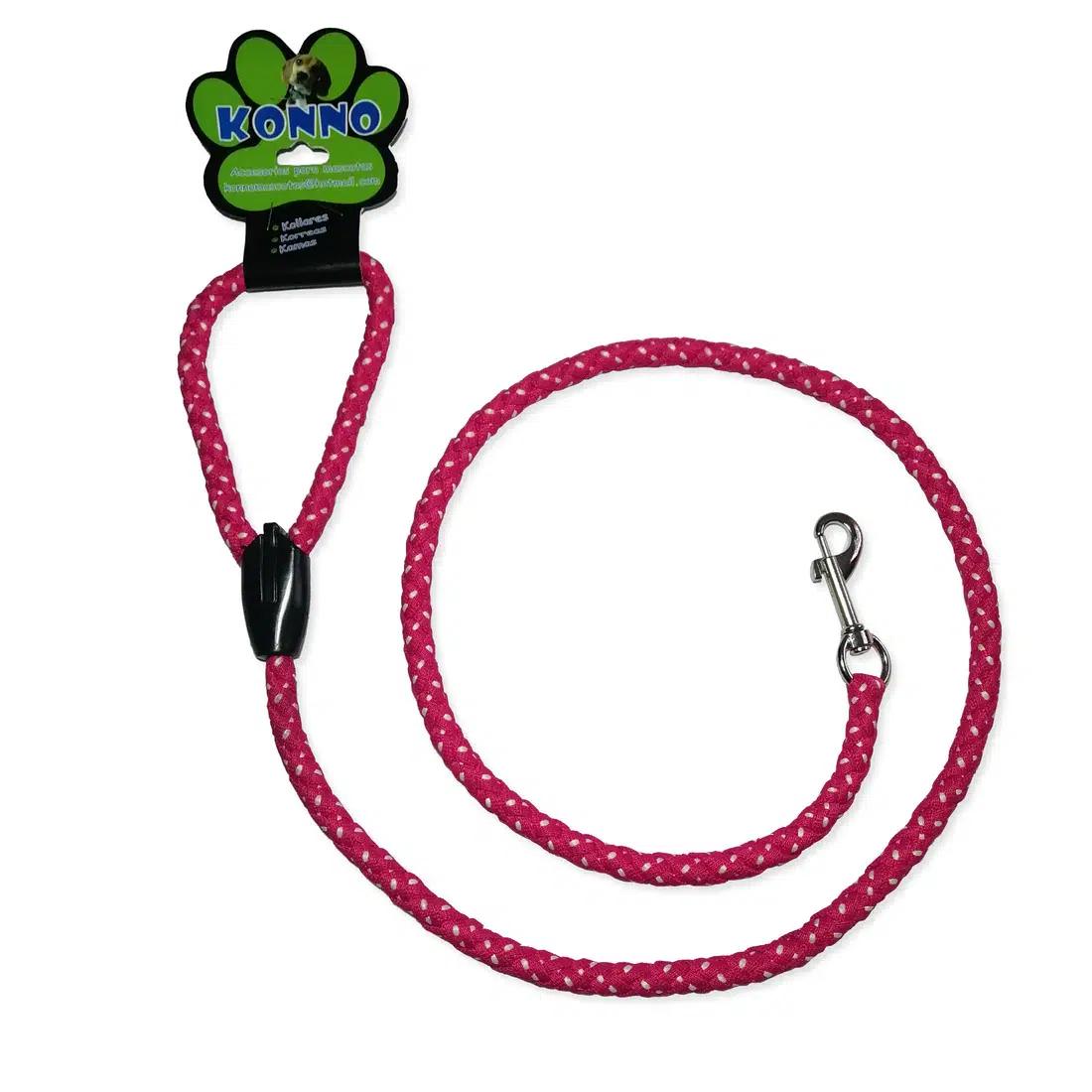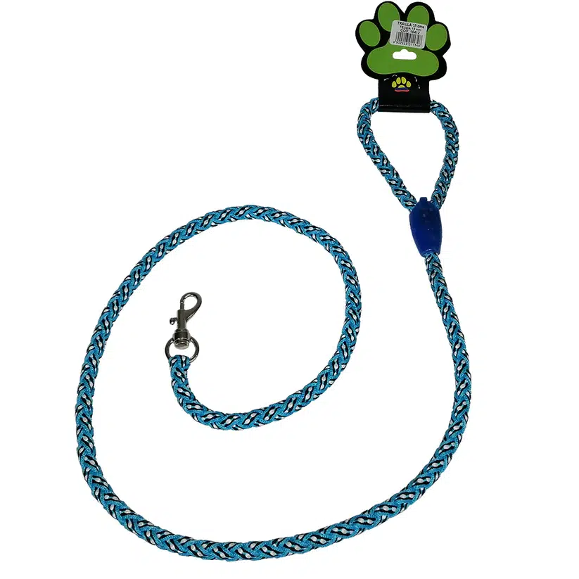 Traílla en cordón delgado de 10 mm de reata trenzada, inyección de plástico en las uniones, mosquetón metálico resistente, longitud 120 cms, es ideal para perros de razas pequeñas y medianas que requieren un control moderado en los paseos diarios, resistente a fuertes tensiones, se puede lavar con cepillo sin que se deshilache, pregunta por los colores disponibles.